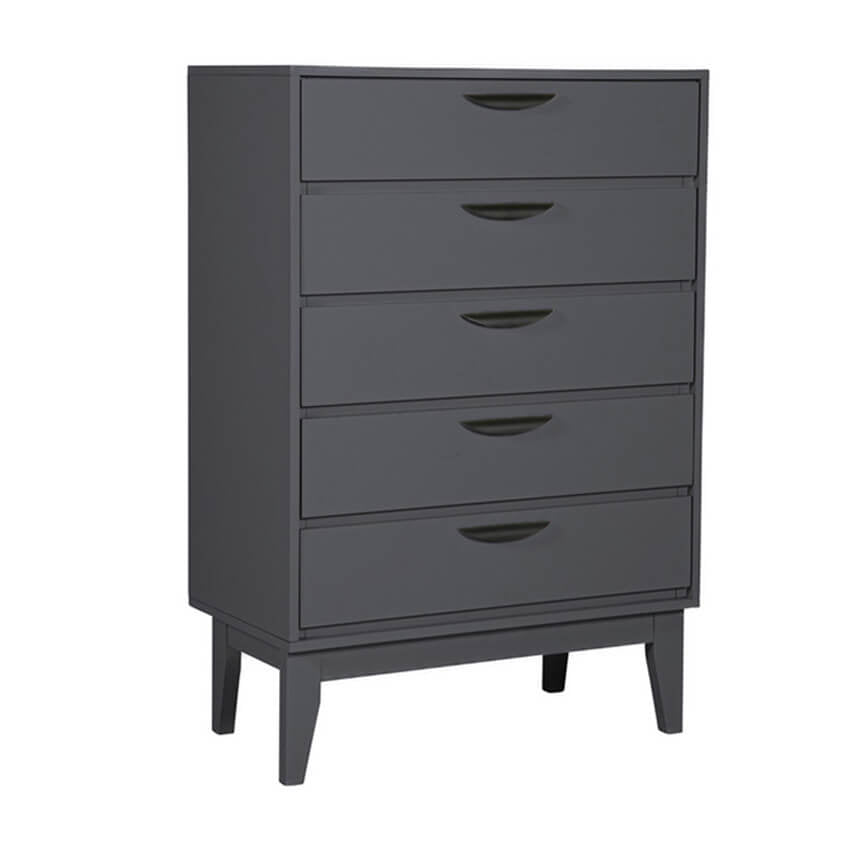 Luna Tall Chest 5 Drawer in Dark Grey—a sleek and modern addition to your bedroom. With its minimalist design and matte painted finish, this drawer offers a clean and contemporary look. Crafted with poplar laminated veneer, it exudes sophistication while maintaining durability. The powder-coated black handles add a subtle touch of elegance to complete the aesthetic.