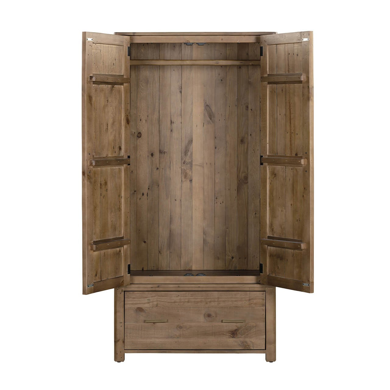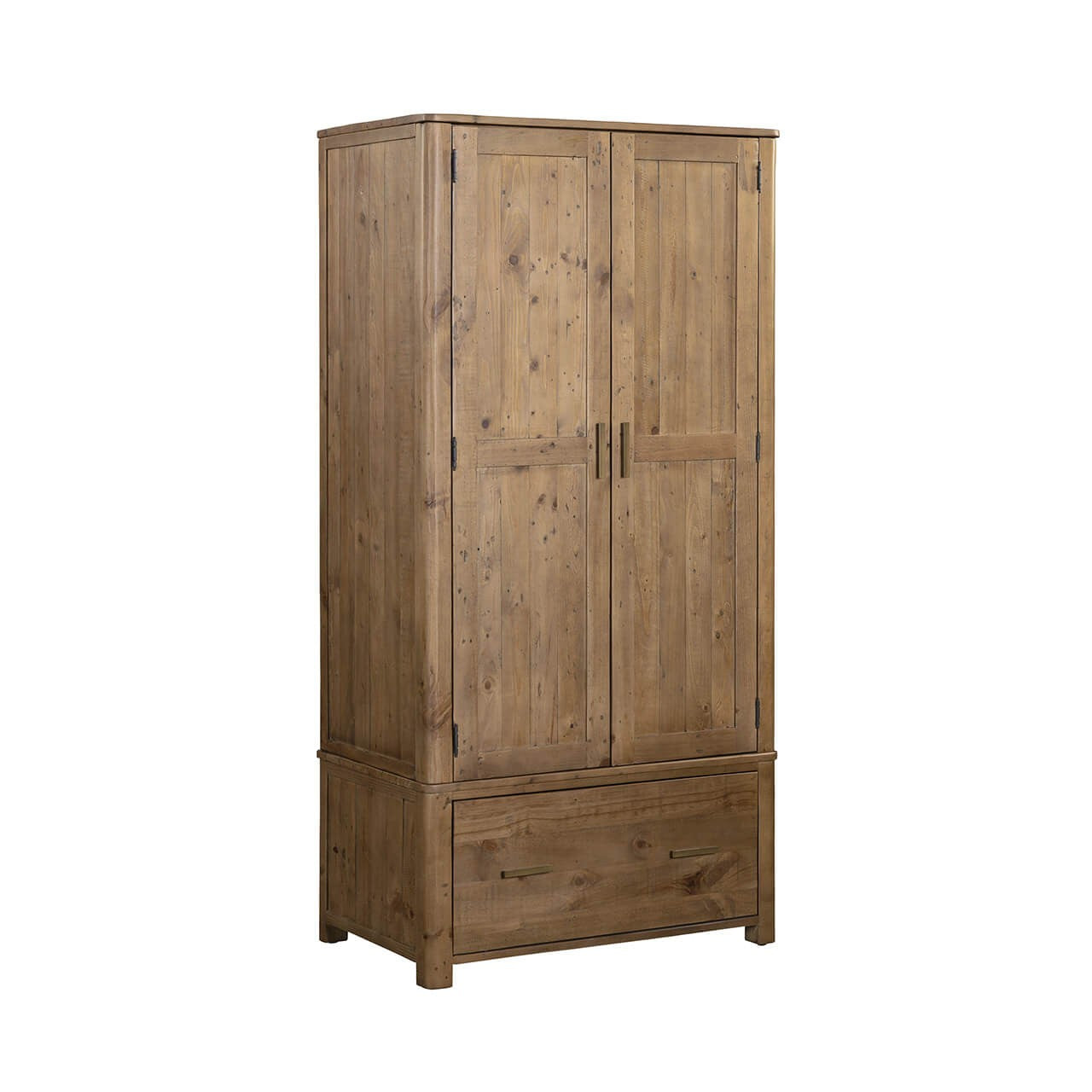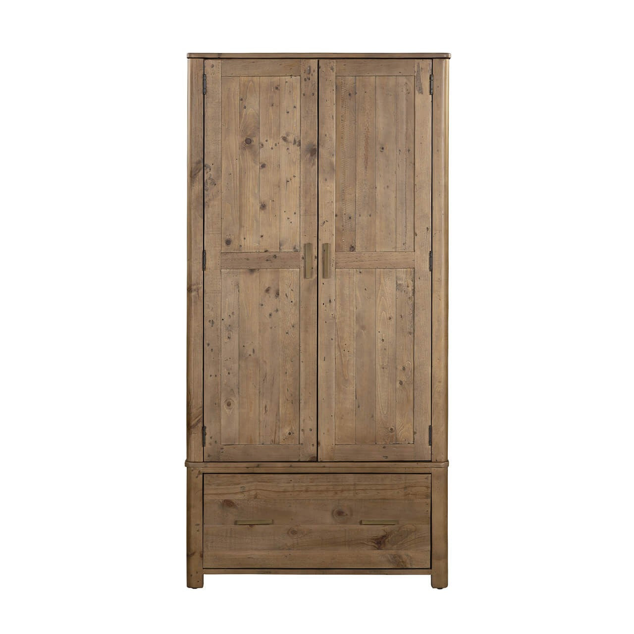 Inola 2 Door 1 Drawer Wardrobe in Cashew brings functional storage and rustic character to the bedroom. Crafted from reclaimed pine with solid wooden legs, it features a spacious interior behind two doors, a lower drawer for added organisation, and elegant brass bar handles. Its warm finish and timeless design make it both practical and stylish.