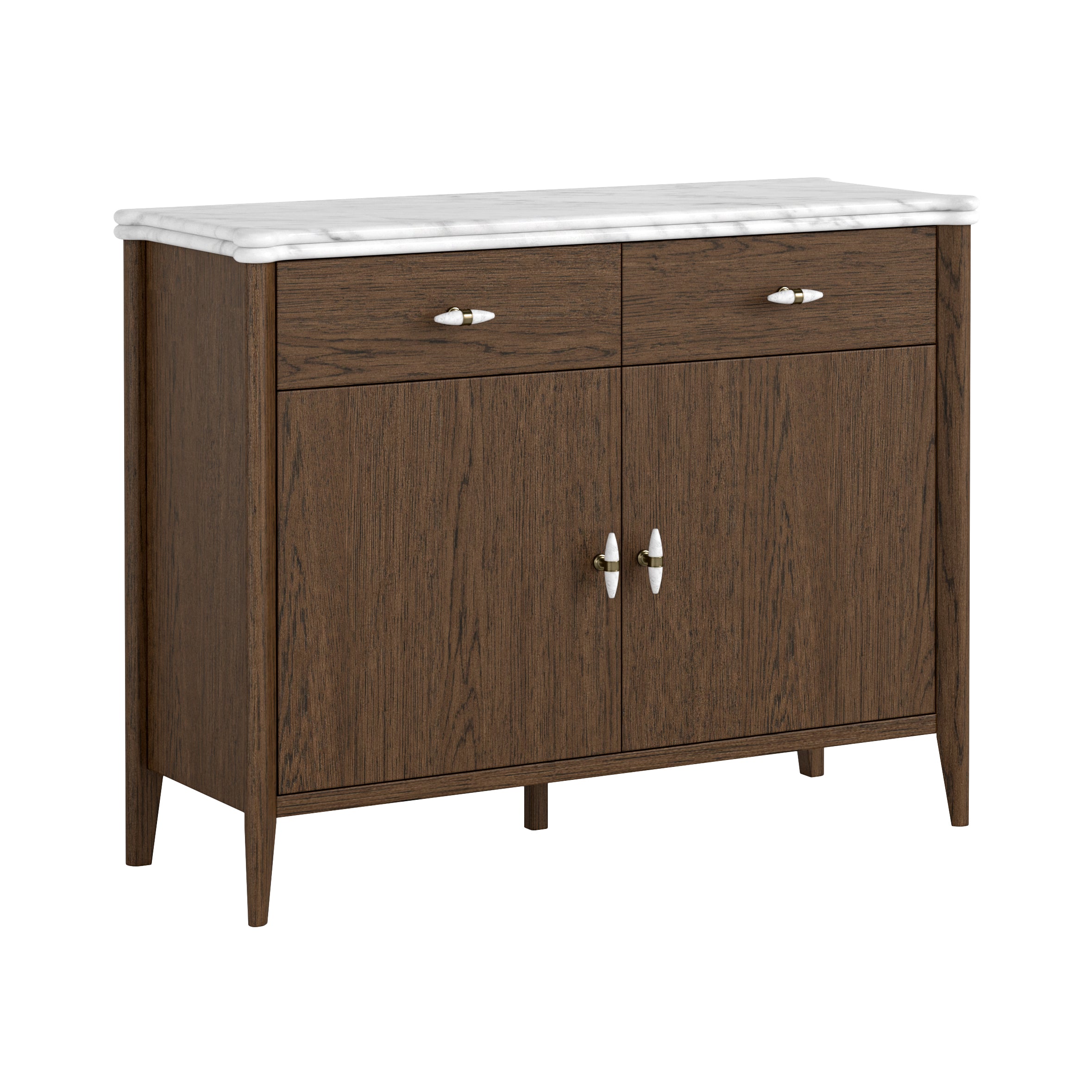 A collection defined by material richness and thoughtful craftsmanship. The signature double-bullnose marble top introduces soft contouring and depth, giving each piece a sculptural elegance. Handles are formed from tapered solid marble, set within an antique-brass ring, creating a refined contrast of tone and texture — a subtle detail that elevates the entire range.
