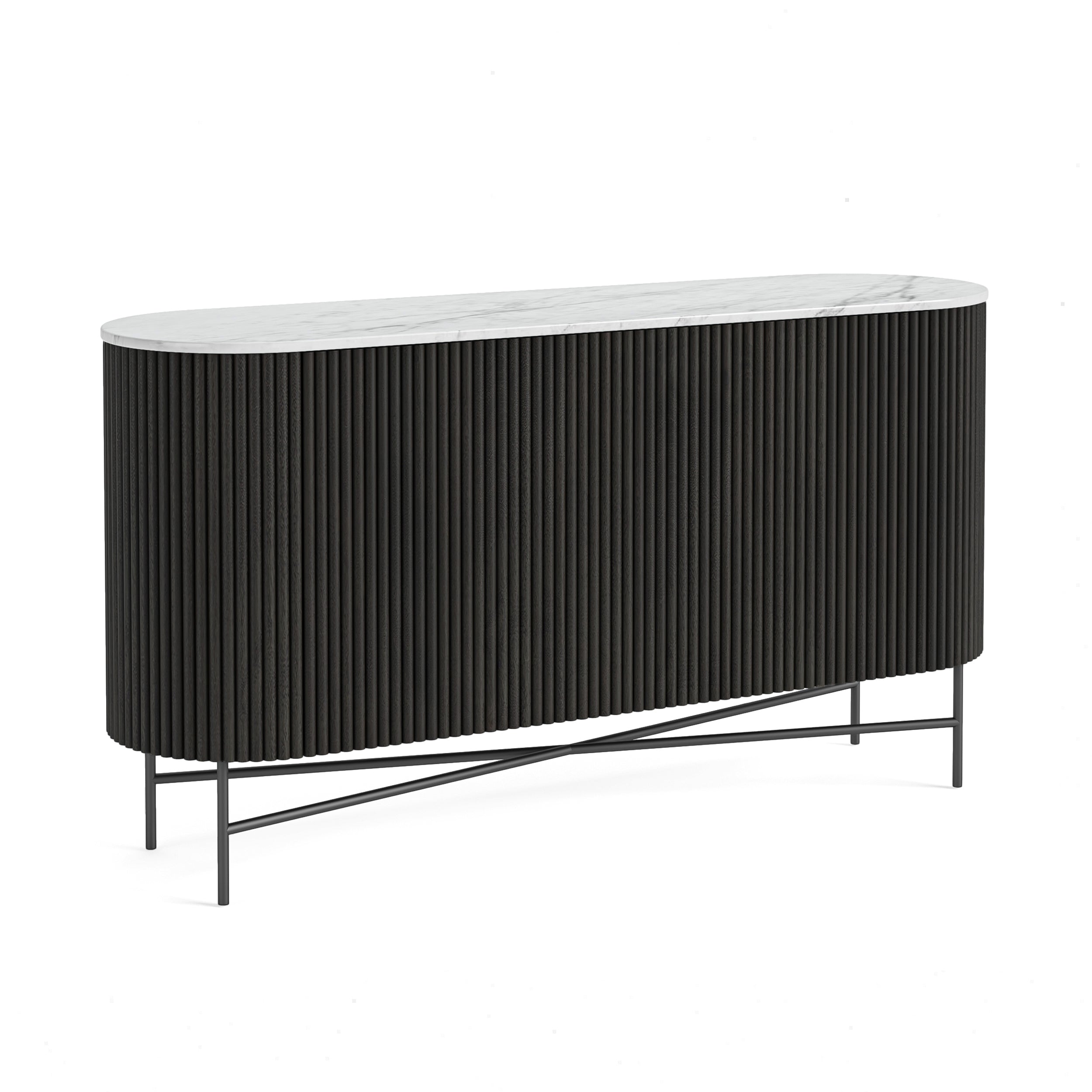 AvailableOur Lucas range accentuates its racetrack curves with dynamic ribbing. Multiple finishes provide harmonious contrast, tinting the solid mango charcoal and leaving the marble top a natural hue. A black-finished base elevates the sideboard with round legs to complement the rounded silhouette. A push on the seamlessly integrated doors opens to inner storage to shelves.