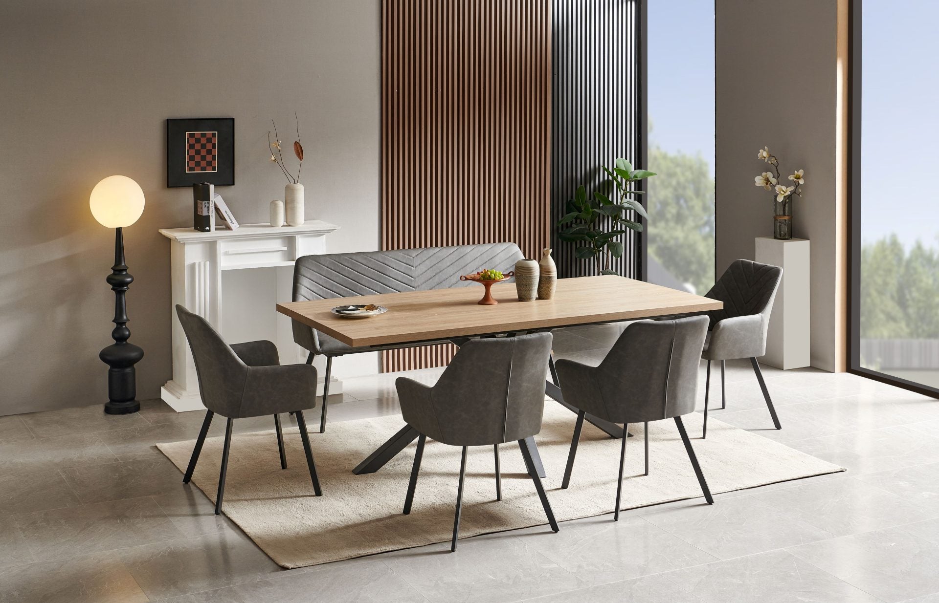 This elegant dining ensemble features a durable oak table engineered to withstand heat and scratches, paired with four contemporary microfibre chairs in charcoal grey accented by black legs. The coordinating bench with matching black legs completes the set, offering flexible seating arrangements for modern dining spaces. Ideal for households seeking both style and practical resilience.