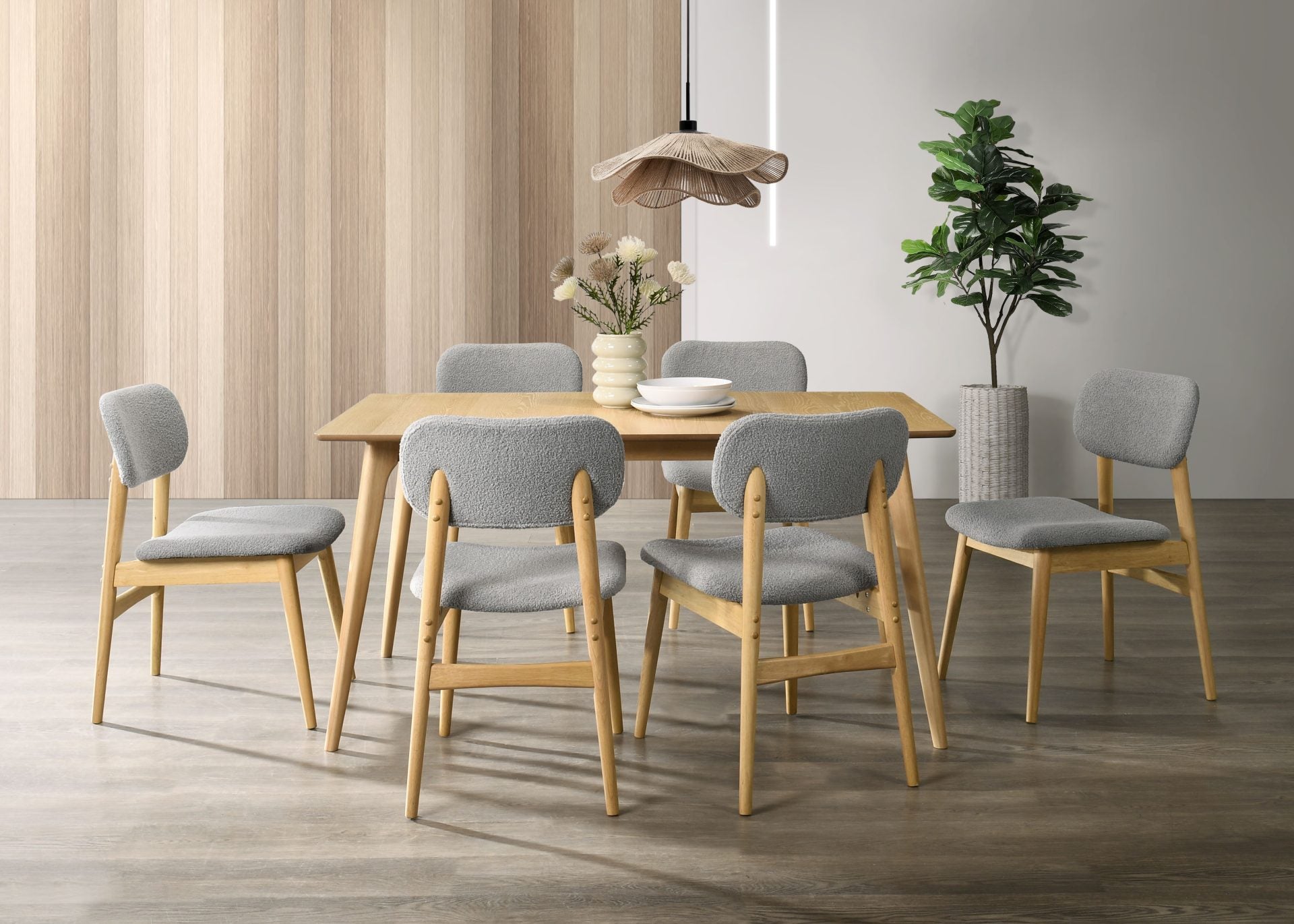 AvailableComplete your dining space with this refined Vienna set, featuring a natural oak veneer table paired with six chairs upholstered in luxurious grey teddy fabric. Expertly crafted for both style and substance, this collection offers the durability of quality veneer construction alongside the comfort of soft, tactile seating. Perfect for creating an inviting focal point in your home.