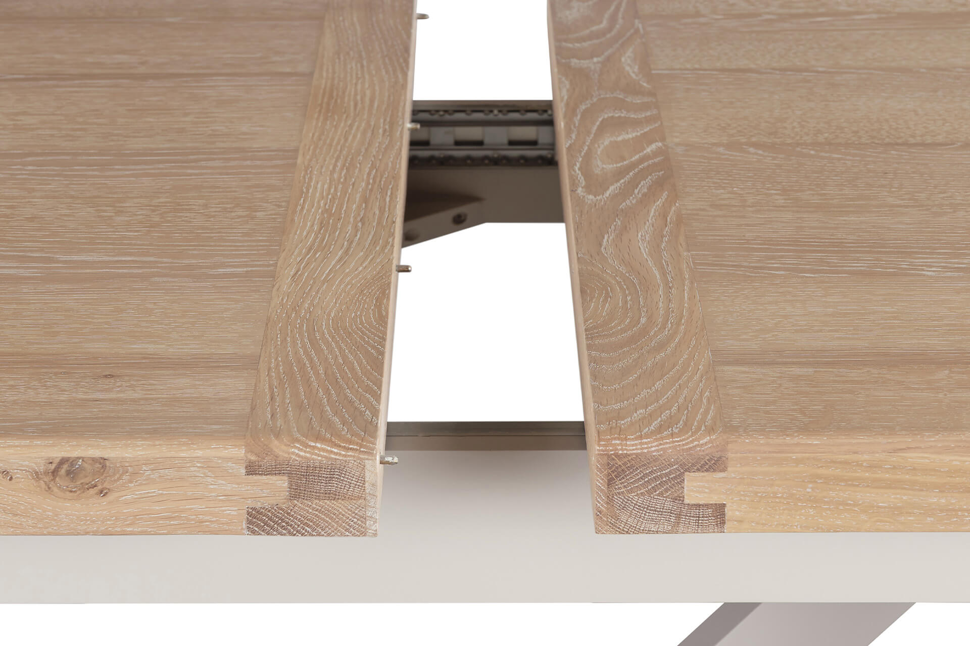 Doune Refectory Extending Dining Table 1900-2350 in Taupe blends timeless design with everyday functionality. Featuring a two-tone look with a washed oak top and painted taupe finish, it includes a central extension leaf to accommodate extra guests with ease. Perfect for both family dining and entertaining.
