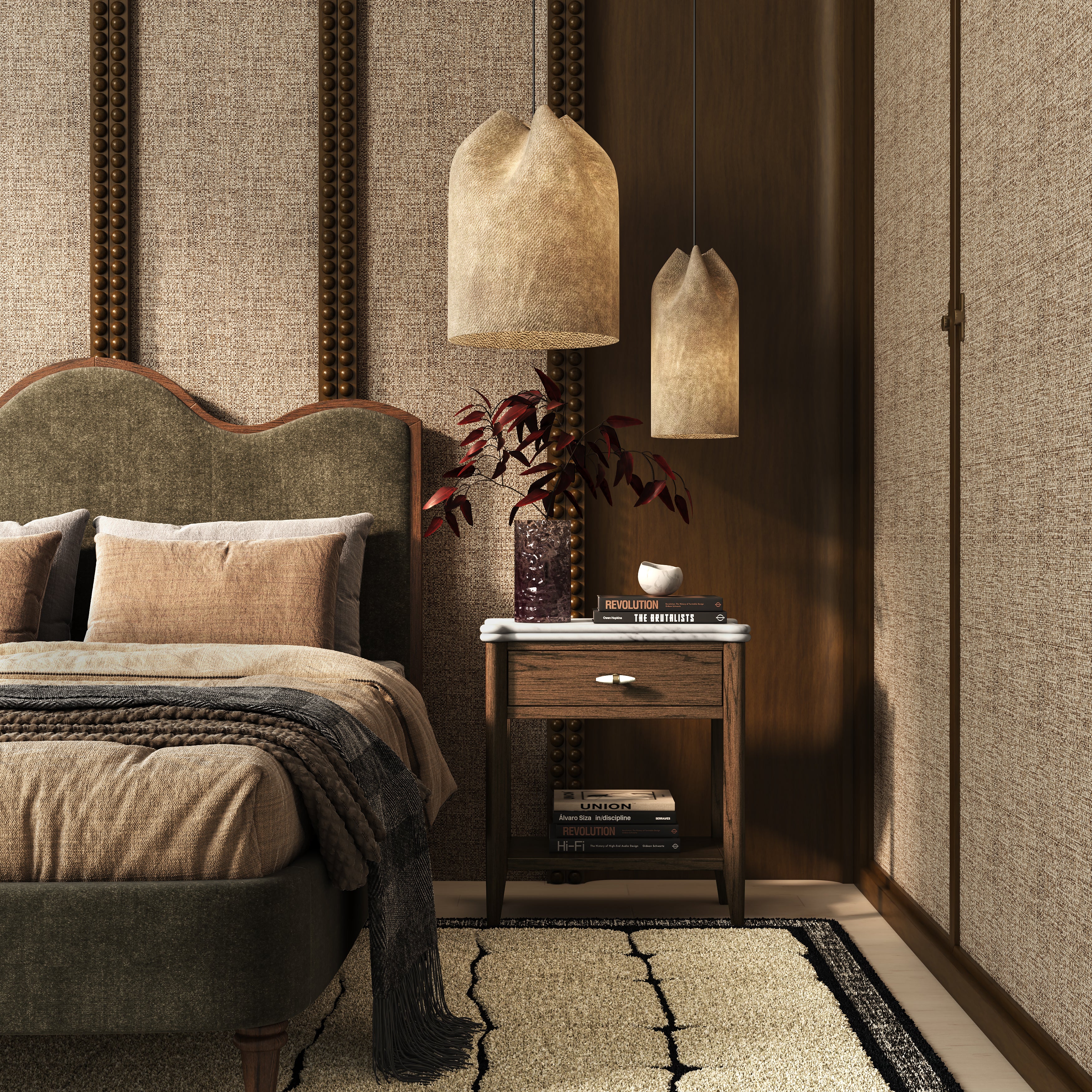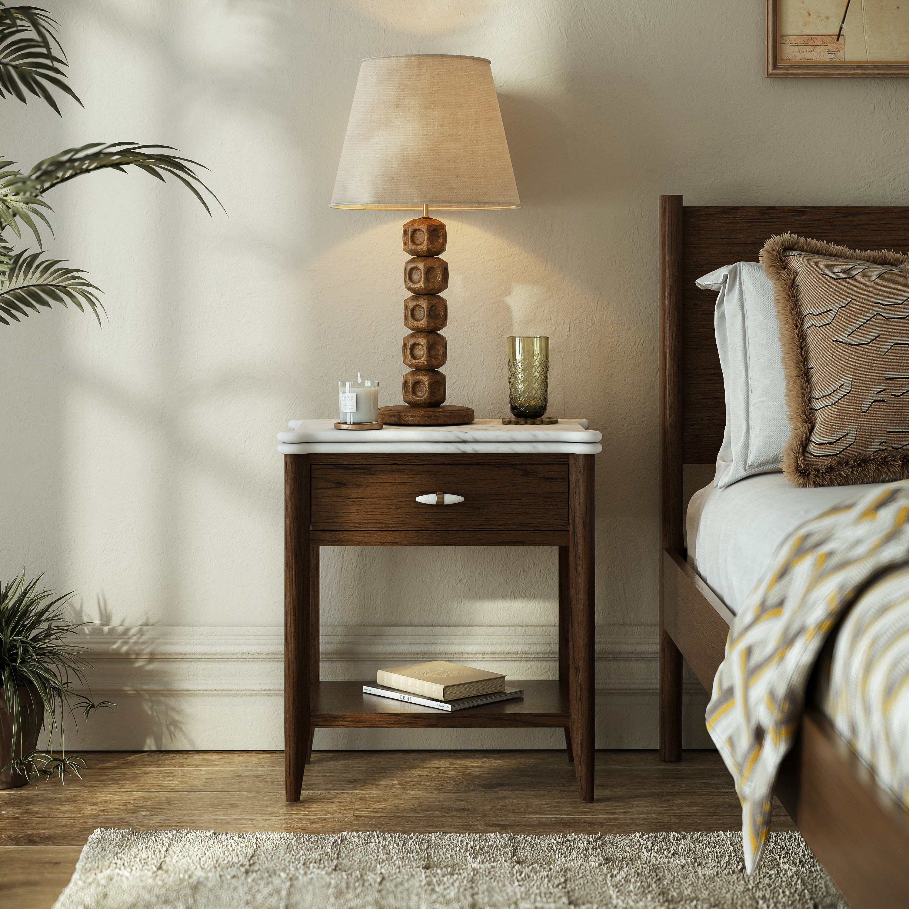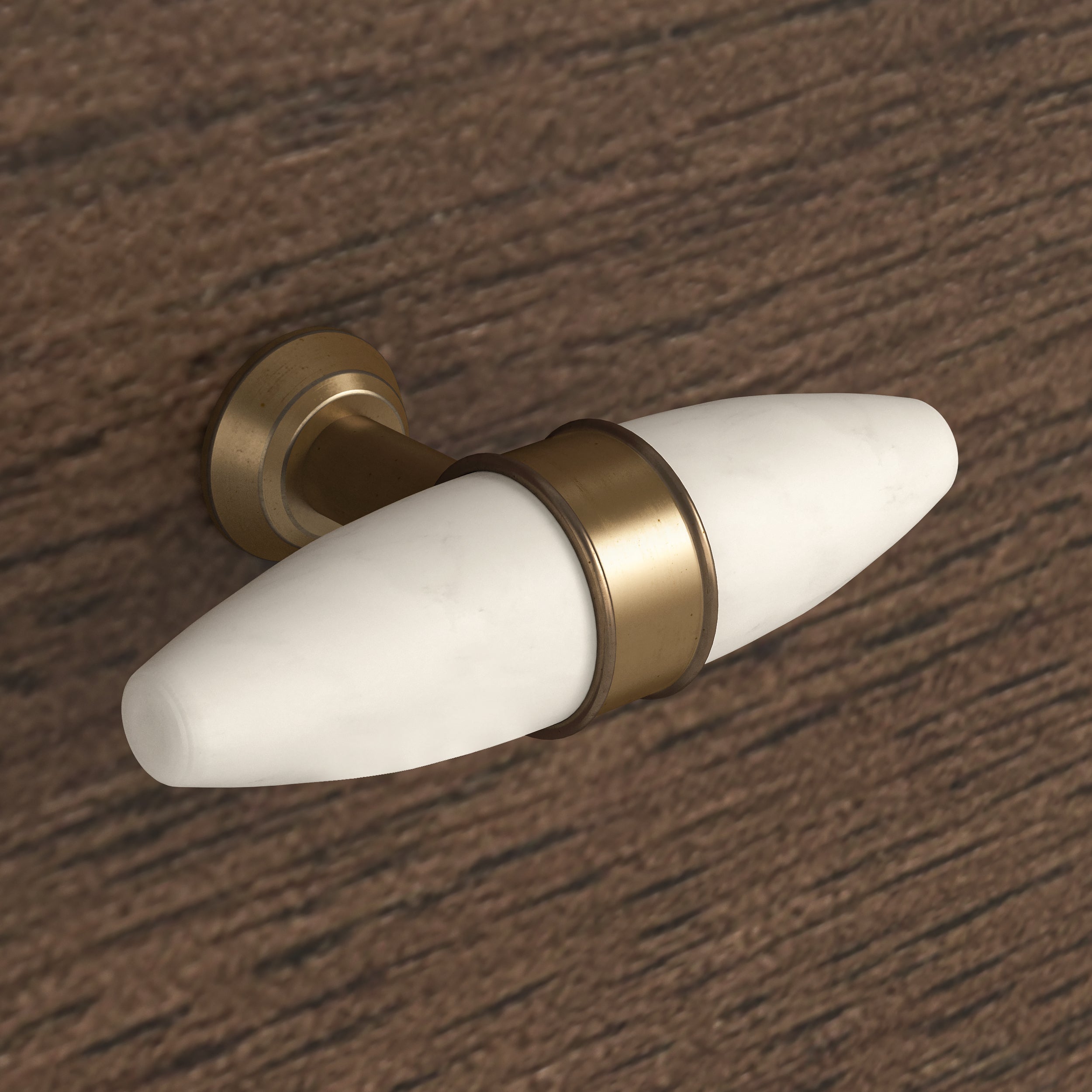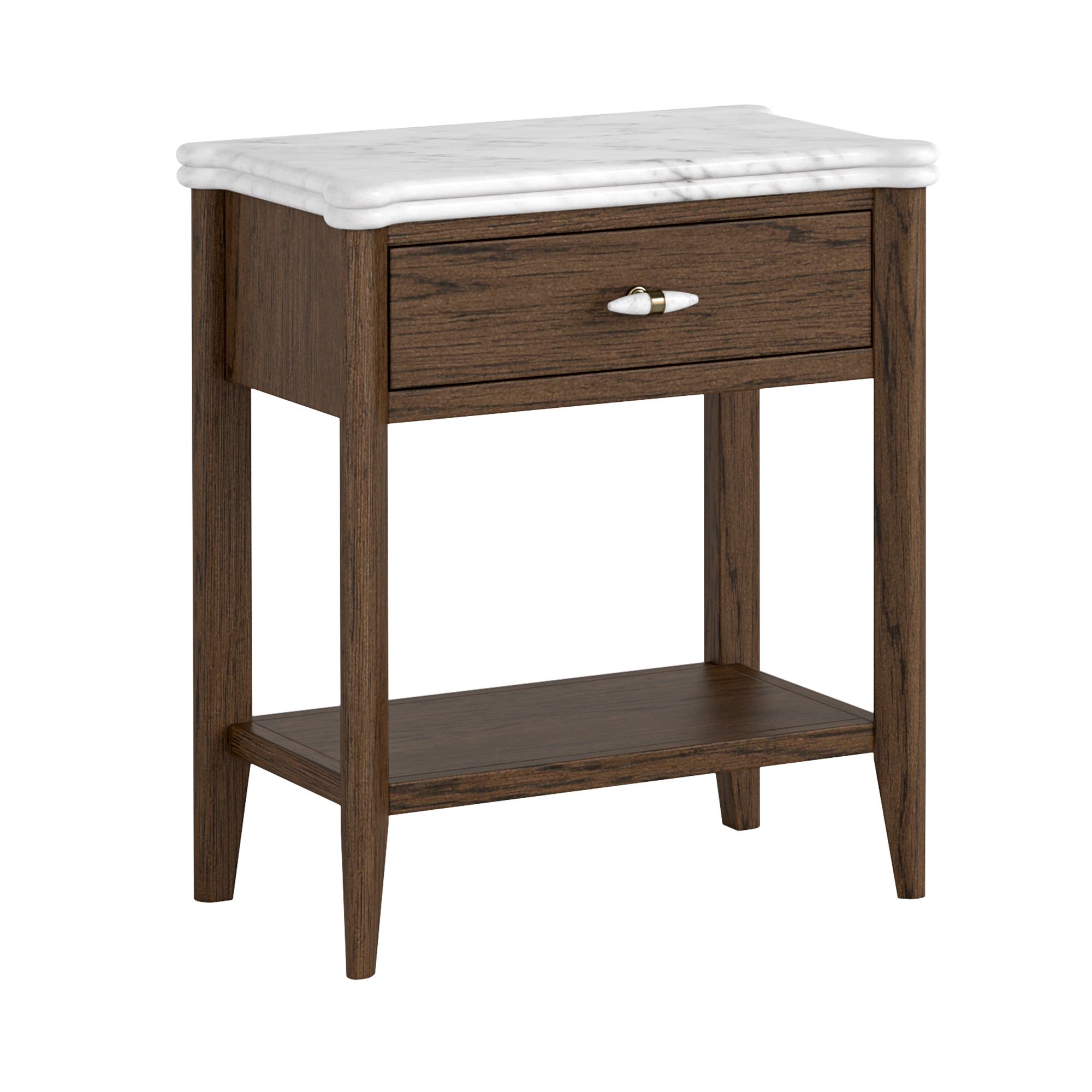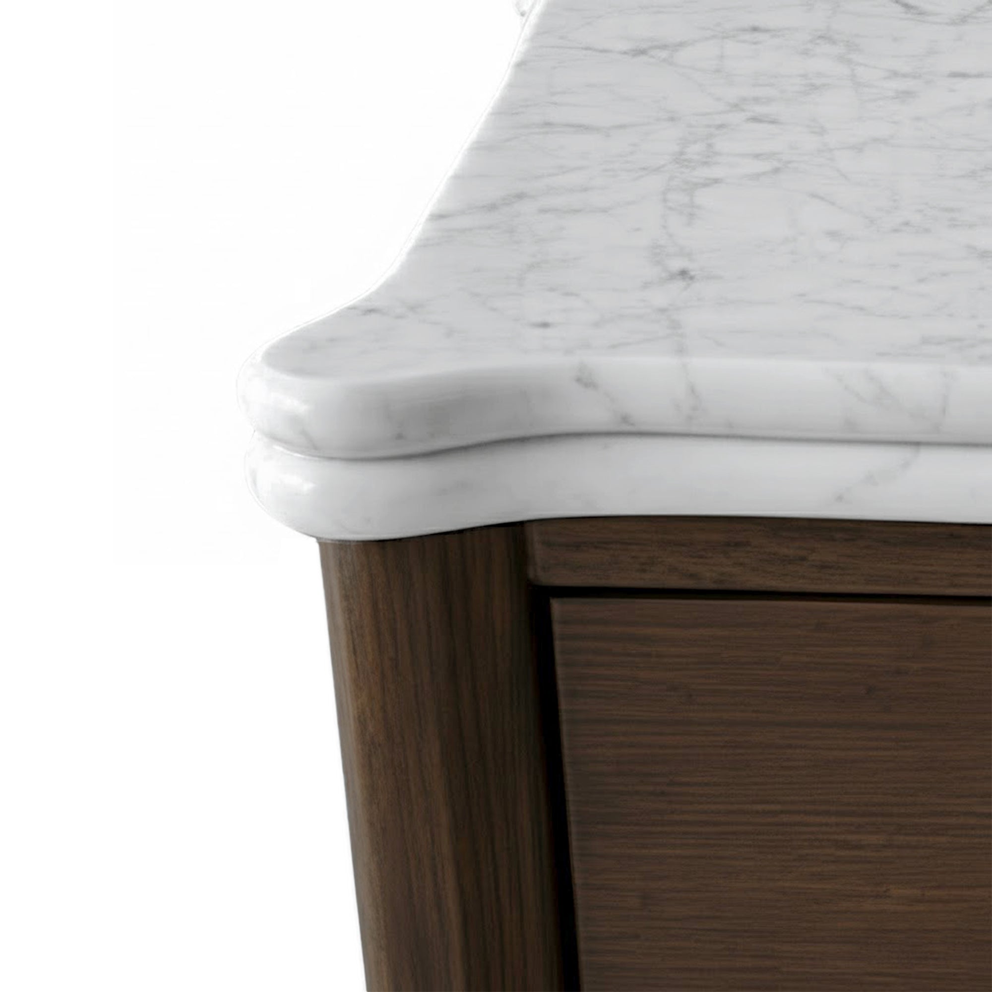 A collection defined by material richness and thoughtful craftsmanship. The signature double-bullnose marble top introduces soft contouring and depth, giving each piece a sculptural elegance. Handles are formed from tapered solid marble, set within an antique-brass ring, creating a refined contrast of tone and texture — a subtle detail that elevates the entire range.