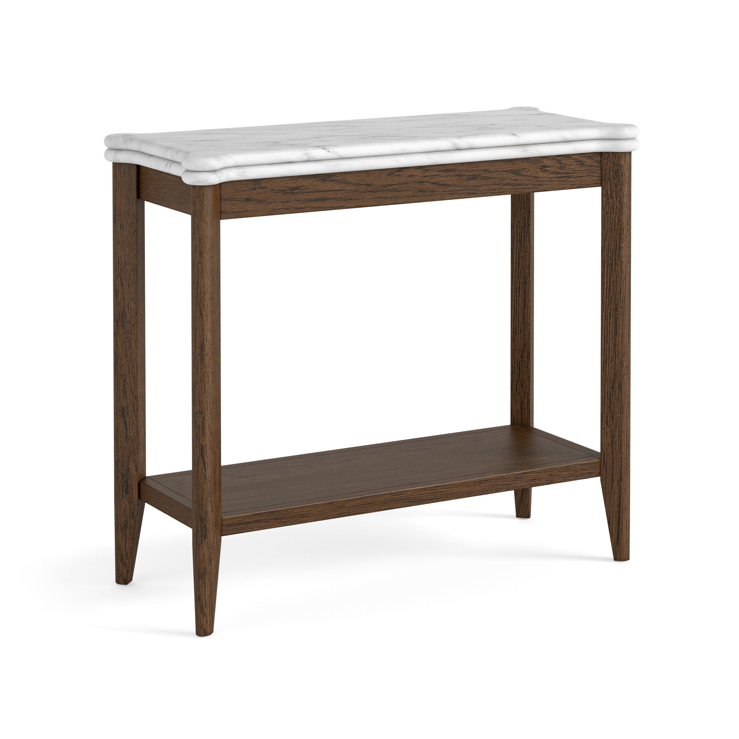 A collection defined by material richness and thoughtful craftsmanship. The signature double-bullnose marble top introduces soft contouring and depth, giving each piece a sculptural elegance. Handles are formed from tapered solid marble, set within an antique-brass ring, creating a refined contrast of tone and texture — a subtle detail that elevates the entire range.