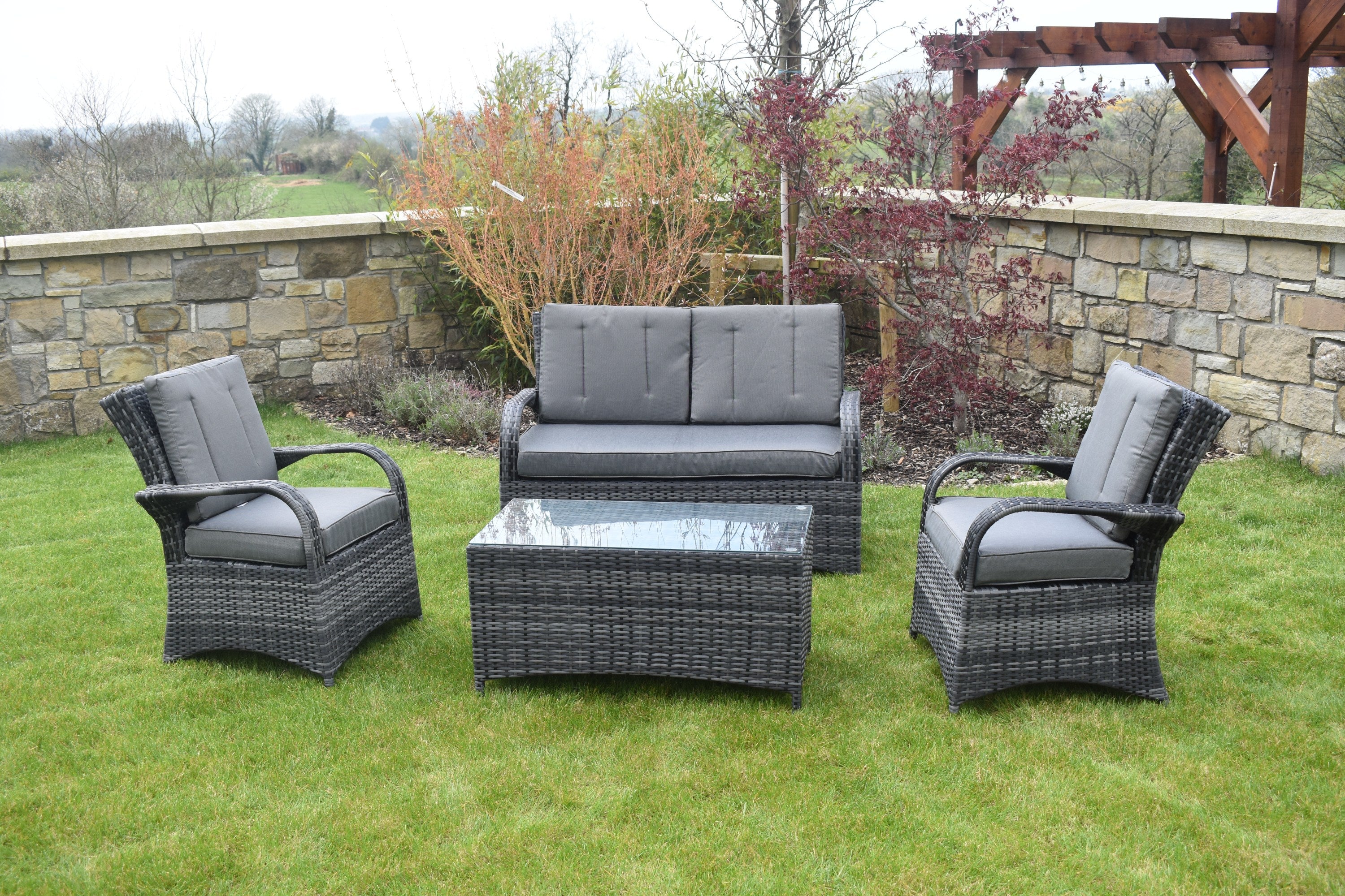 AvailableThe Barcelona sofa set is the perfect piece to complete any garden. This grey rattan sofa is the king of comfort due to its comfortable back and seat pads. There is eye-catching button-back detail on the back-pads which are all detachable. The glass-topped rattan coffee table is brilliant due it’s large size and sturdiness. Garden furniture is very on-trend at the moment, particularly rattan sets which are durable and perfect for outdoor weather conditions. To ensure optimal care, we recommend storing outdoor furniture when not in use. This helps maintain the colour and quality of your set.