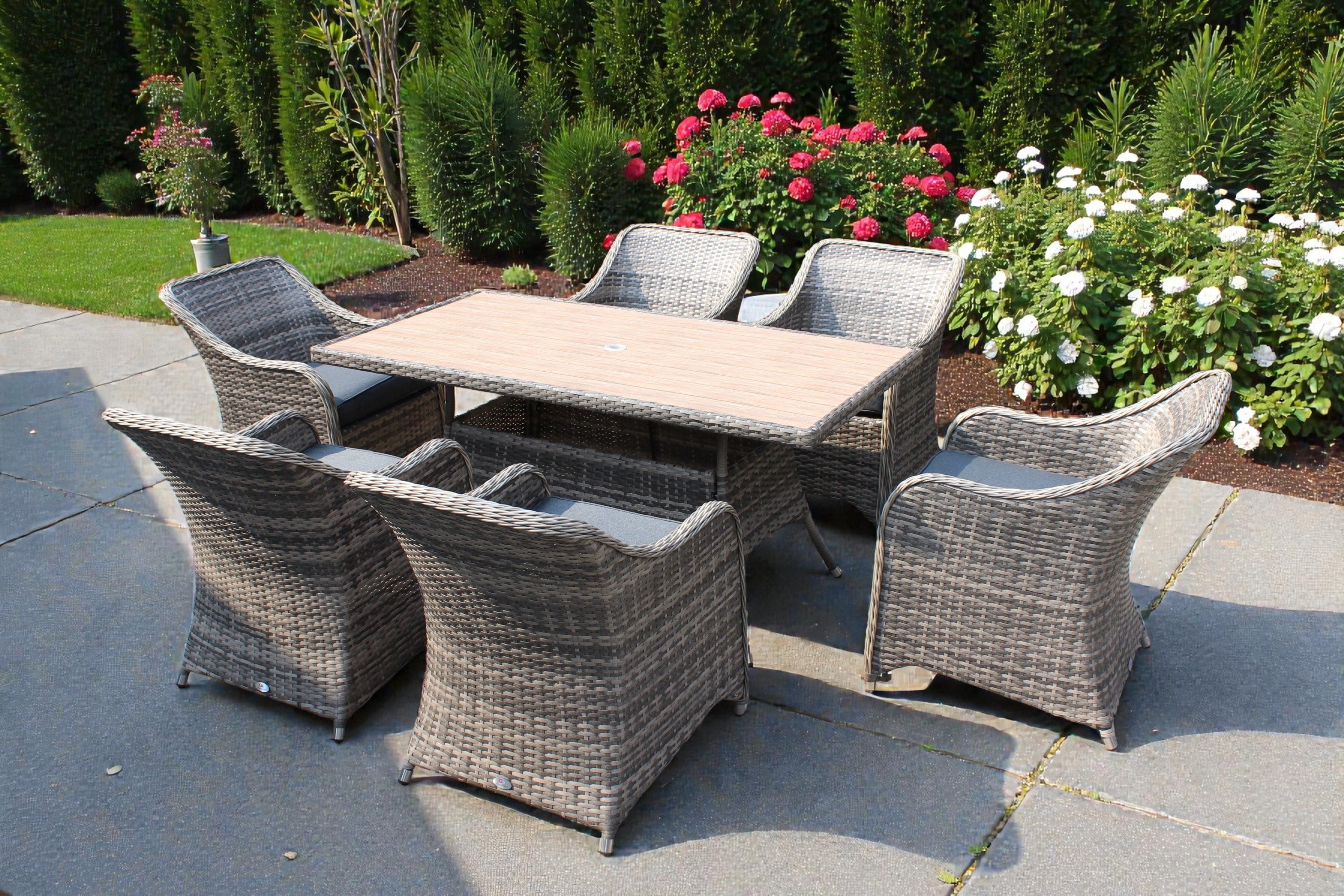 AvailableMake the outdoors your personal paradise with this superb set of table and chairs. Finished in a stylish wicker, the chairs are complete with luxurious soft polyester cushions, while the table features an elegant Polywood desktop and a central hole for an umbrella.